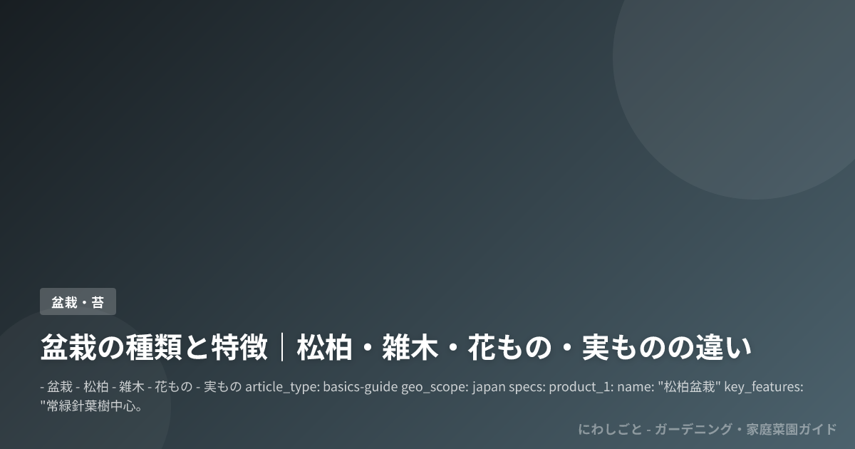 - 実もの article_type: basics-guide geo_scope: japan specs: product_1: name: "松柏盆栽" key_features: "常緑針葉樹中心。年間を通して姿が安定し、風格や幹芸を楽しみやすい" product_2: name: "雑木盆栽" key_features: "落葉樹・広葉樹中心。新緑、紅葉、落葉後の枝姿まで四季の変化が大きい" product_3: name: "花もの盆栽" key_features: "花の時期が最大の見どころ。華やかだが剪定時期を誤ると花芽に影響しやすい" product_4: name: "実もの盆栽" key_features: "実の色づきや結実が主役。受粉、水切れ、鳥害など結実管理がポイント" internal_link_suggestions: