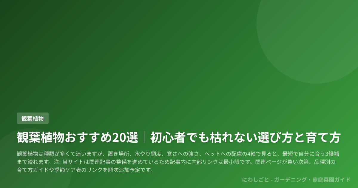 観葉植物は種類が多くて迷いますが、置き場所、水やり頻度、寒さへの強さ、ペットへの配慮の4軸で見ると、最短で自分に合う3候補まで絞れます。