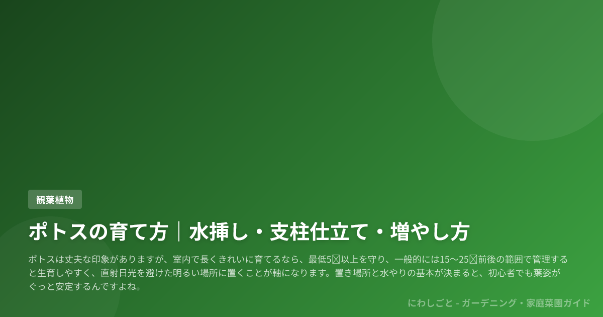 ポトスは丈夫な印象がありますが、室内で長くきれいに育てるなら、最低5℃以上を守り、一般的には15〜25℃前後の範囲で管理すると生育しやすく、直射日光を避けた明るい場所に置くことが軸になります。